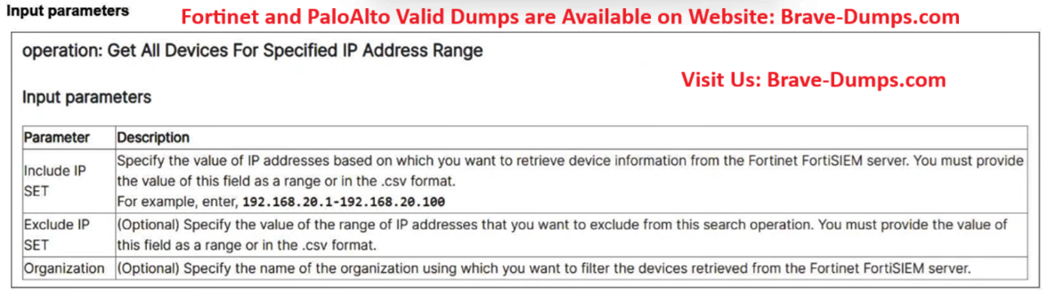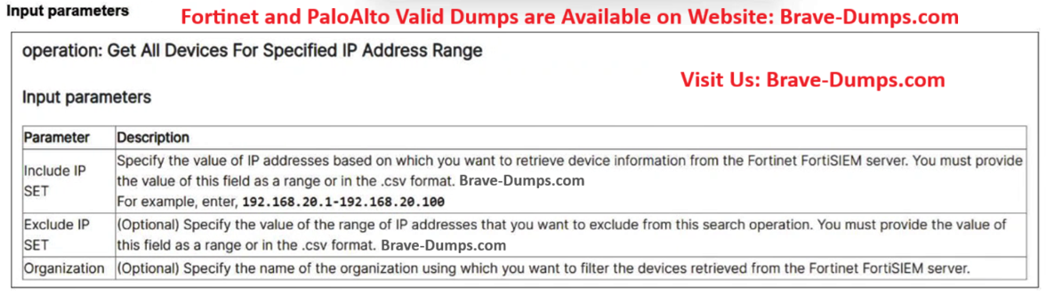 Refer to the exhibit. A list of FortiSIEM connector actions is shown. You want to create a playbook on FortiSOAR that allows you to accomplish the following: 1- Manually input a range of IP addresses. 2- Use the connector action in the exhibit to retrieve a list of devices from the FortiSIEM configuration management database (CMDB) within that IP address range. 3- For each returned result, create an asset record based on the IP address of the device. Which combination and order of step operations fulfills the requirements with the fewest required playbook steps? (Choose one answer)