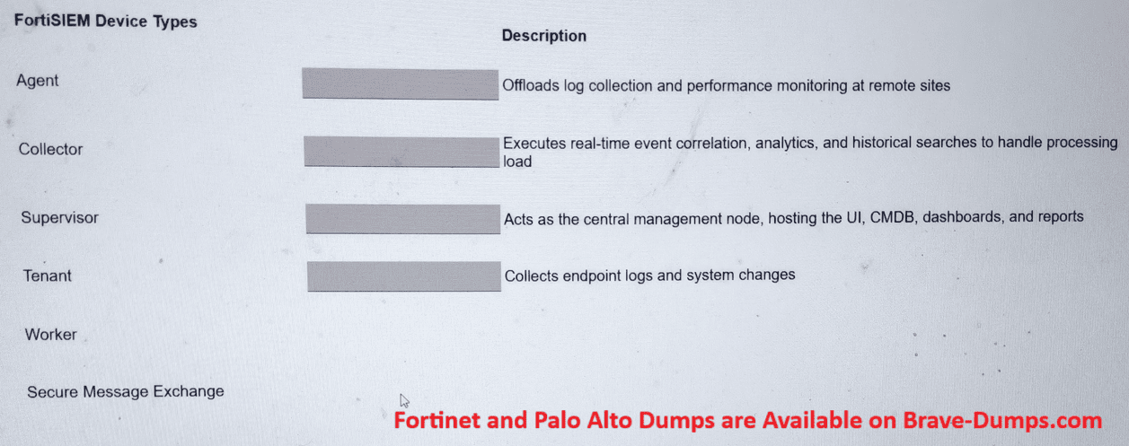 Match the FortiSIEM device type to its description. Select each FortiSIEM device type in the left column, hold and drag it to the blank space next to its corresponding description in the column on the right. Once you match a device type to its description, you can move it again if you want to change your answer by clicking on the device type name. You need to match four device types to its description in the work area. (Choose one answer)