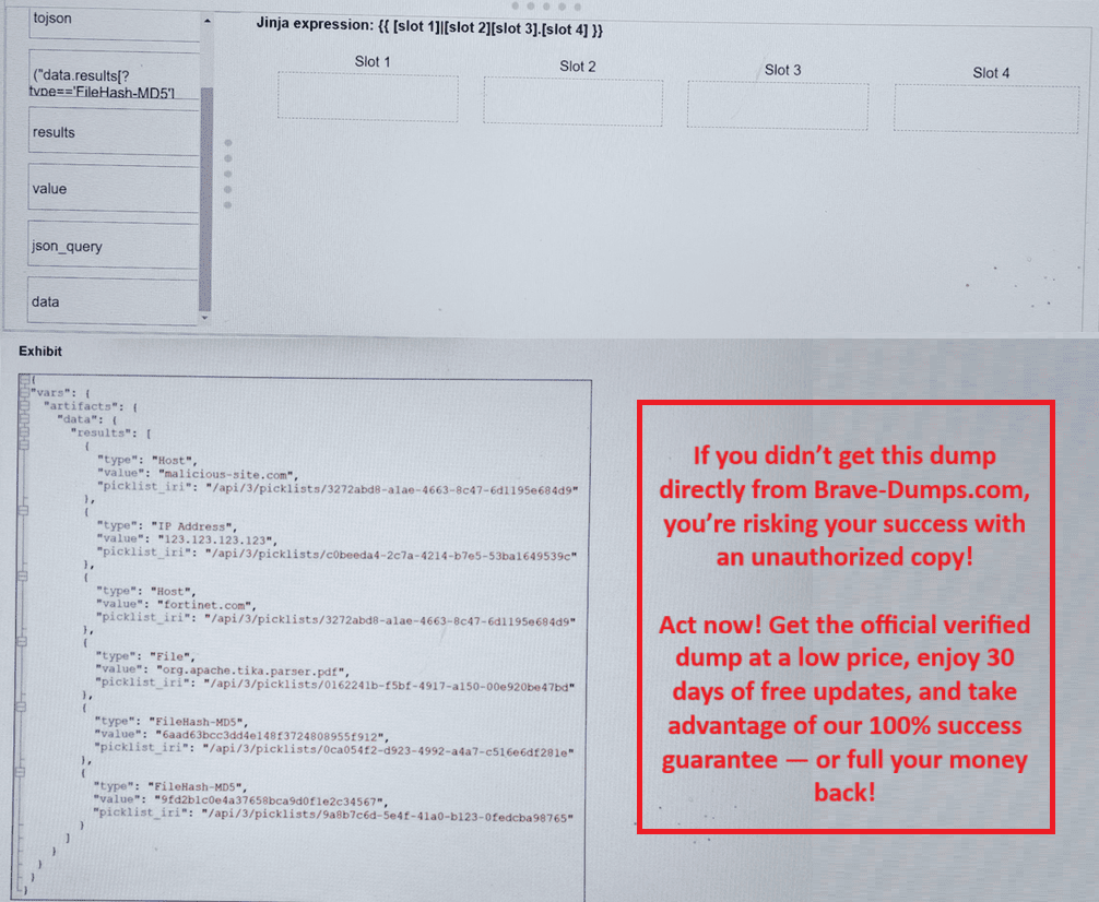 Refer to the exhibit. What is the correct Jinja expression to filter the results to show only the MD5 hash values? {{ [slot 1] | [slot 2] [slot 3].[slot 4] }} Select the Jinja expression in the left column, hold and drag it to a blank position on the right. Place the four correct steps in order, placing the first step in the first slot. Once you place an expression, you can move it again if you want to change your answer before moving to the next question. You need to drop four Jinja expressions in the work area. Select and drag the screen divider to change the viewable area of the source and work areas. (Choose four answers)