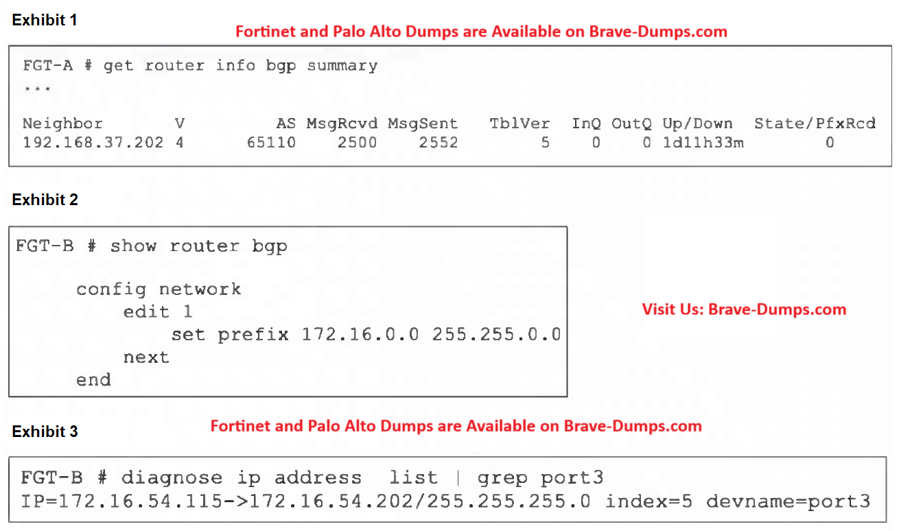 Refer to the exhibits. An administrator is attempting to advertise the network configured on port3. However, FGT-A is not receiving the prefix. Which two actions can the administrator take to fix this problem? (Choose two answers)