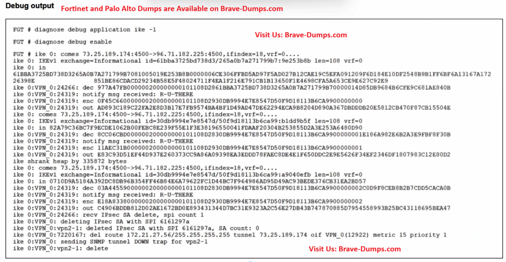 D: The FortiGate is clearly receiving packets (as evidenced by the comes 73.25.189.174:4500 and recv IPsec SA delete lines), so it is not dropping all incoming IKE traffic.
