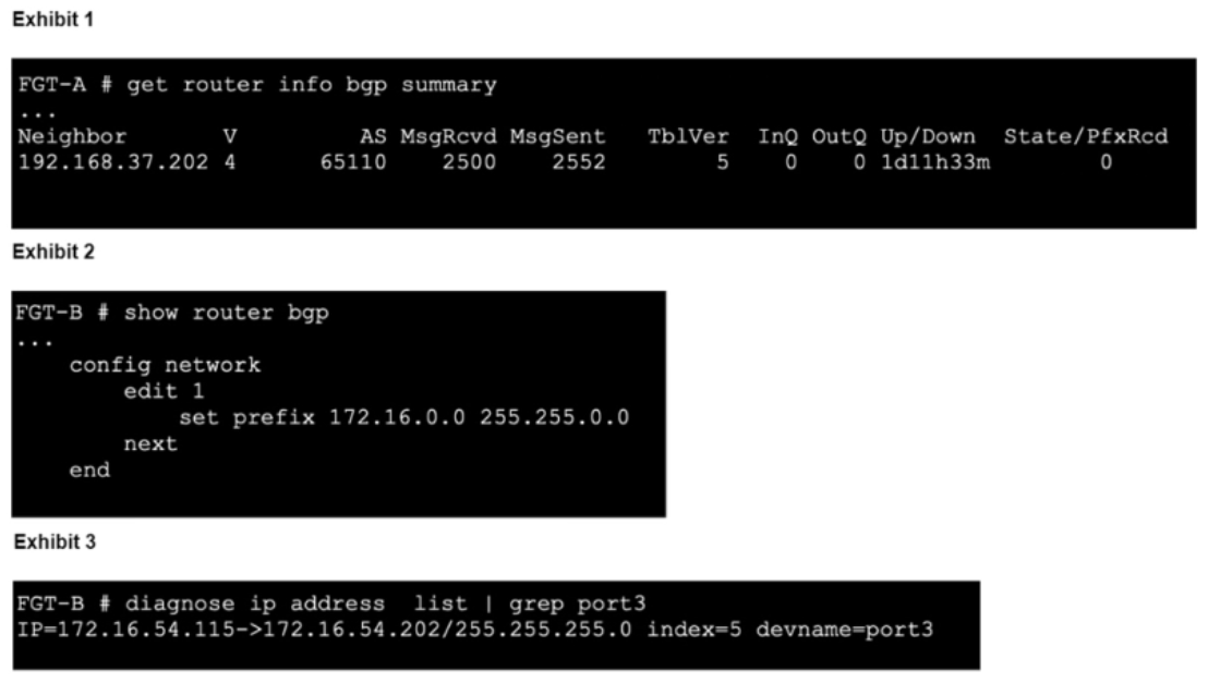 Refer to the exhibits. An administrator is attempting to advertise the network configured on port3. However, FGT-A is not receiving the prefix. Which two actions can the administrator take to fix this problem? (Choose two answers)