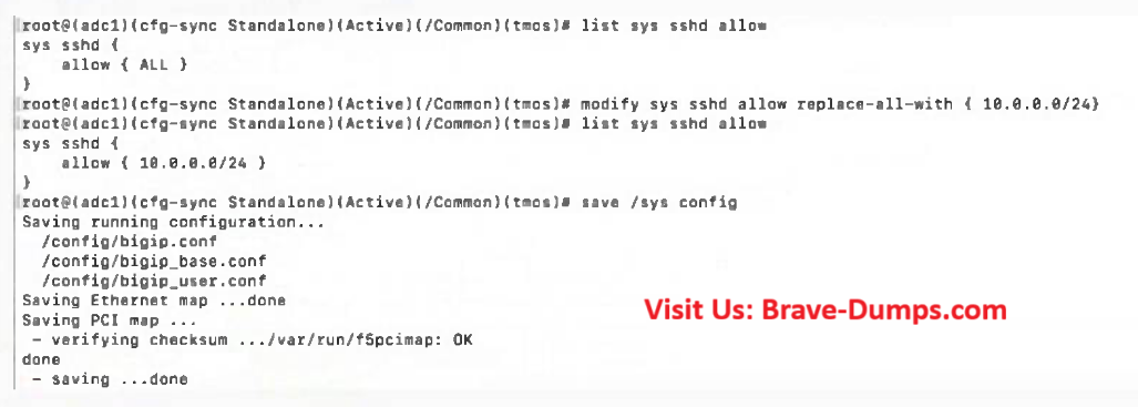In order to configure allowed IP addresses for SSH access to a BIG-IP device, the BIG-IP Administrator has issued the commands shown in the exhibit. Which IP addresses will have SSH access after issuing the shown commands? (Choose two answers)