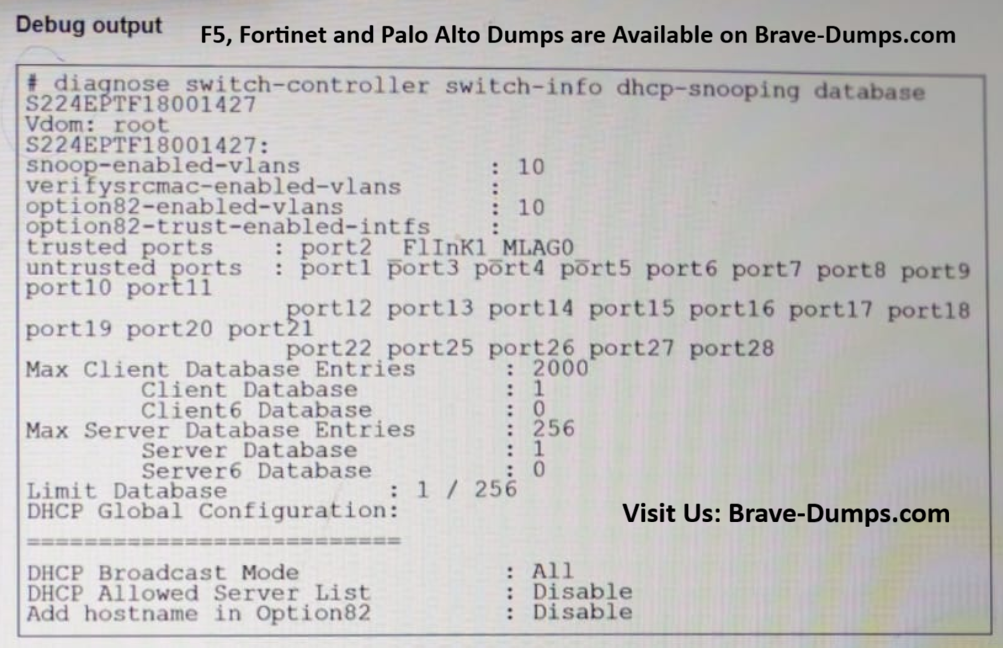 Why: The output shows option82-enabled-vlans : 10 (so Option 82 is enabled on VLAN 10) and DHCP Broadcast Mode : All (broadcasts aren’t being restricted).