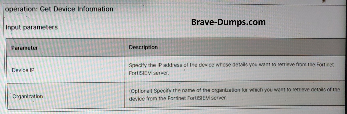 Refer to the exhibit. The input of a FortiSIEM connector action is shown. You want to create a playbook on FortiSOAR that allows you to accomplish the following: Manually input an IP address. Use the connector action in the exhibit to retrieve a device from the FortiSIEM configuration management database (CMDB) with that IP address. Ask the SOC manager to review the information pulled from FortiSIEM about that device. If the manager approves, an asset record is created. Which combination and order of step operations fulfills the requirements with the fewest required playbook steps? (Choose one answer)