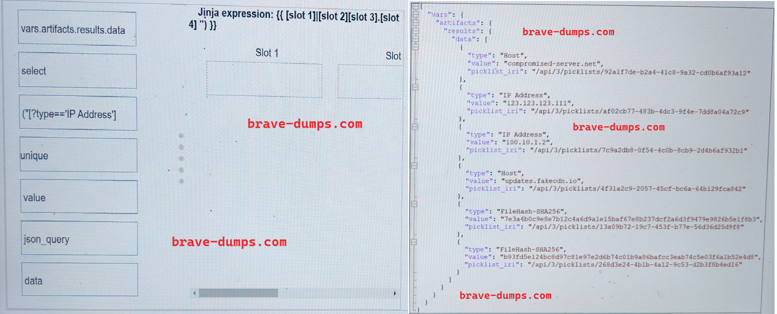 Refer to the exhibit. What is the correct order of Jinja expressions to filter the results to show only the IP address values? {{ [slot 1]|[slot 2][slot 3].[slot 4] " }} Select each Jinja expression in the left column and drag and drop it into a blank slot on the right to place the four expressions in the correct order. After placing an expression, you can move it again if you want to change your answer. You must drop four Jinja expressions in the work area. Select and drag the screen divider to change the viewable area of the source and work areas. NOTE "This is a drag-and-drop question, so the answer options should not be available. Please check the correct answers inside the question rectangle instead." (Choose one answer)