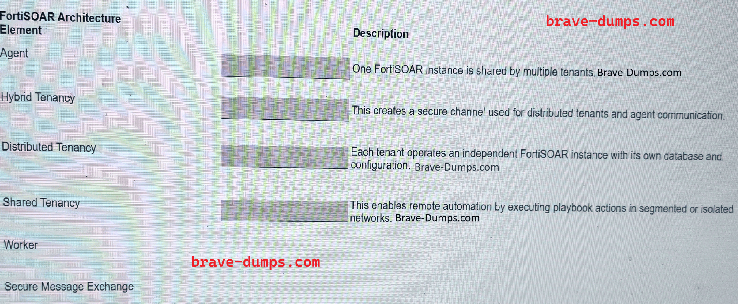 Match the FortiSOAR architecture element to its description. Select each FortiSOAR architecture element in the left column and drag and drop it into the blank space next to its corresponding description in the right column. After matching an element, you can move it again if you want to change your answer. You must match four elements with their descriptions in the work area. NOTE"This is a drag-and-drop question, so the answer options should not be available. Please check the correct answers inside the question rectangle instead." (Choose four answers)