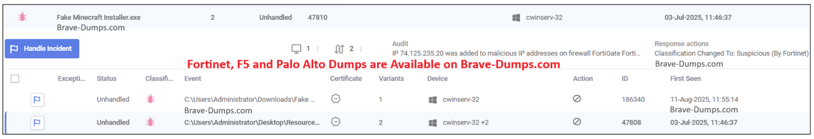 The status is “Unhandled,” meaning the incident has not been resolved. Additionally, the second event shows “cwinserv-32 +2,” indicating that multiple devices are affected.