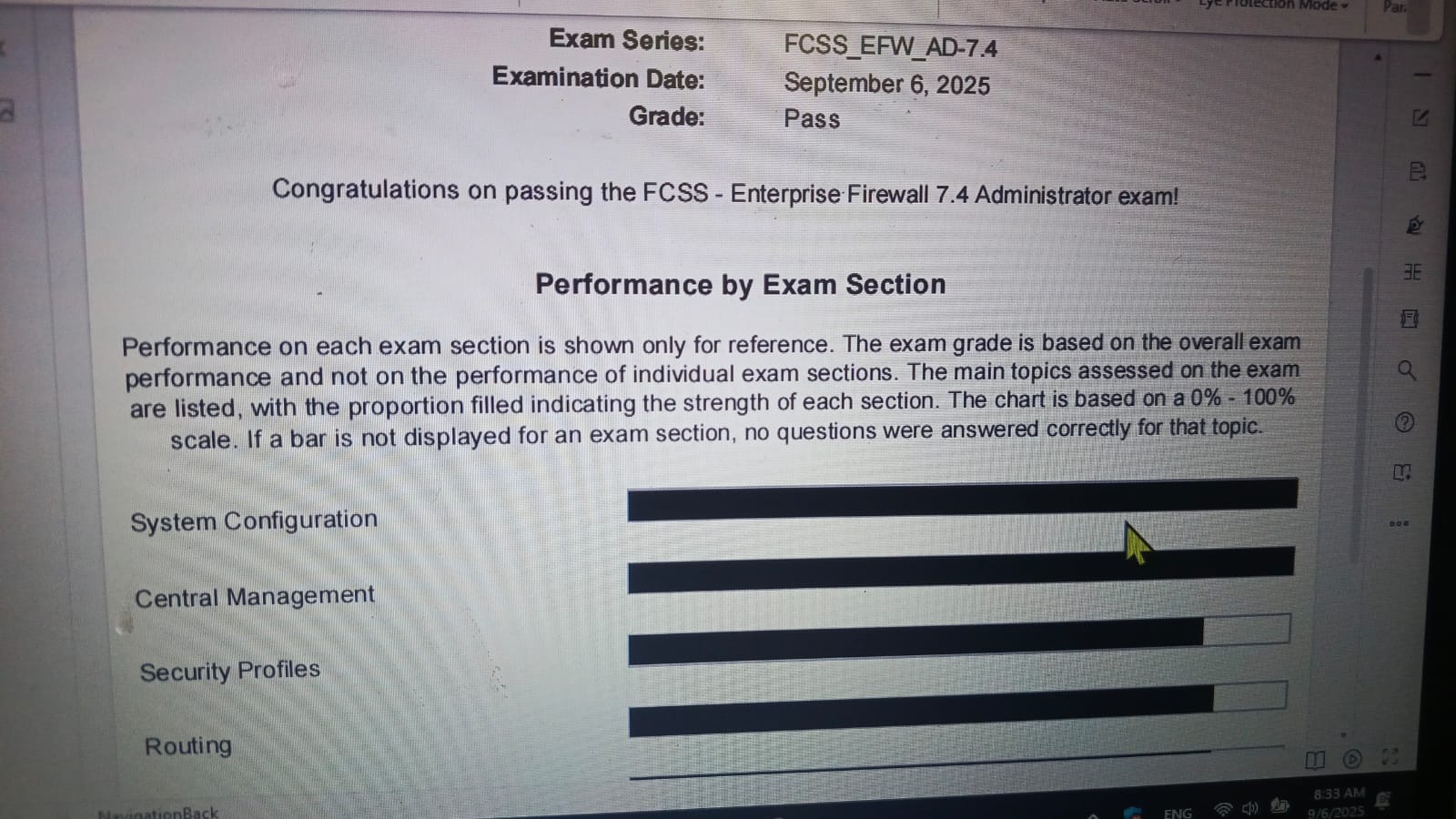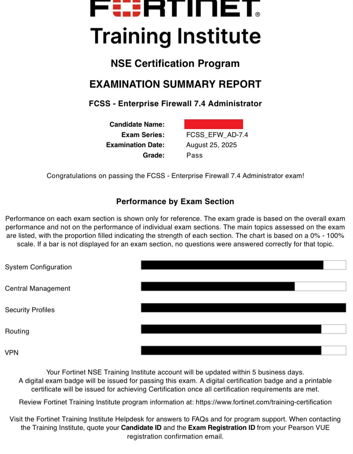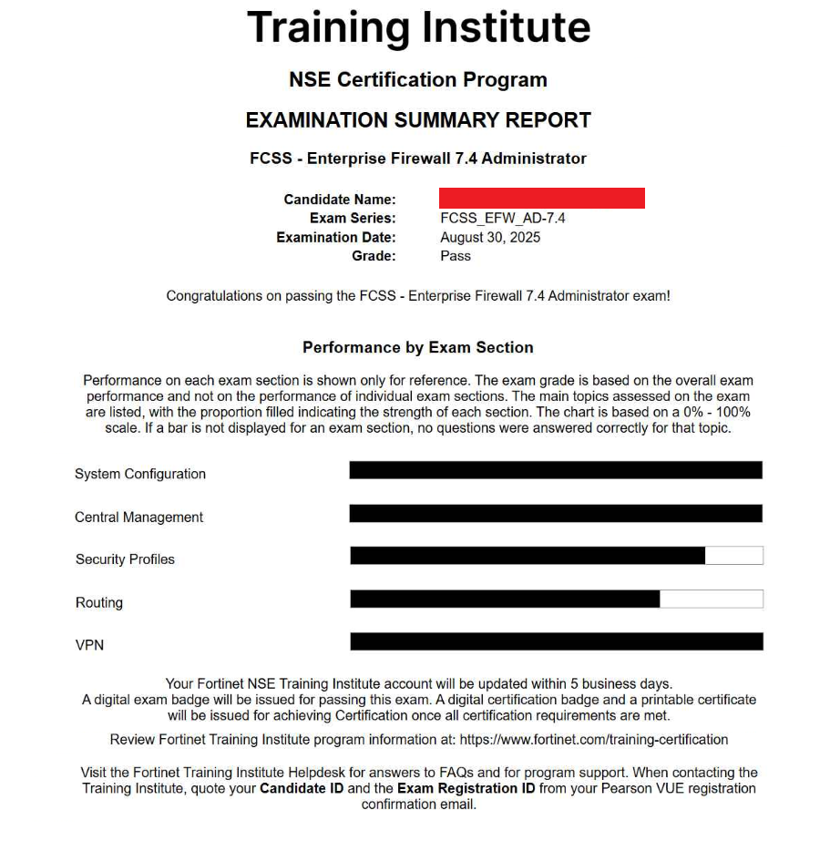 100% Score in the Real Enterprise Firewall 7.4 Exam (EFW_AD-7.4) at the Pearson VUE Testing Center