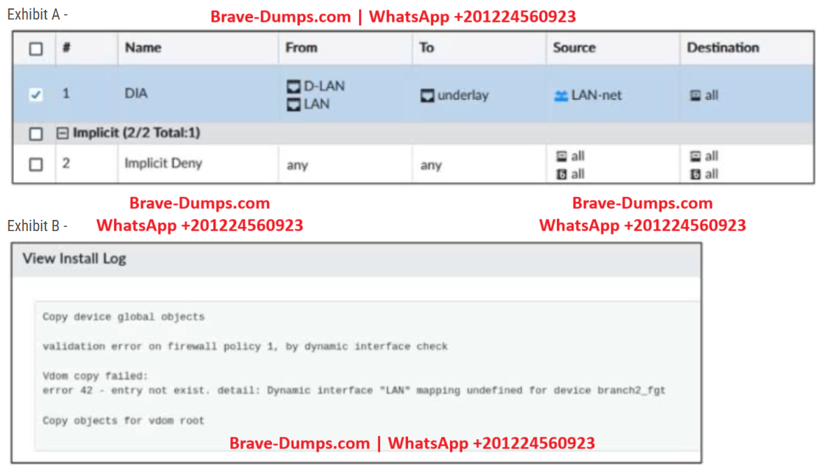 Exhibit A shows a policy package definition. Exhibit B shows the install log that the administrator received when he tried to install the policy package on FortiGate devices.