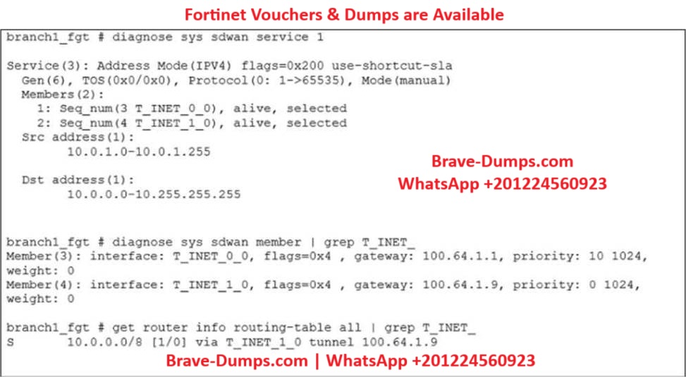 An administrator is troubleshooting SD-WAN on FortiGate. A device behind branch1_fgt generates traffic to the 10.0.0.0/8 network. The administrator expects the traffic to match SD-WAN rule ID 1 and be routed over T_INET_0_0. However, the traffic is routed over T_INET_1_0.