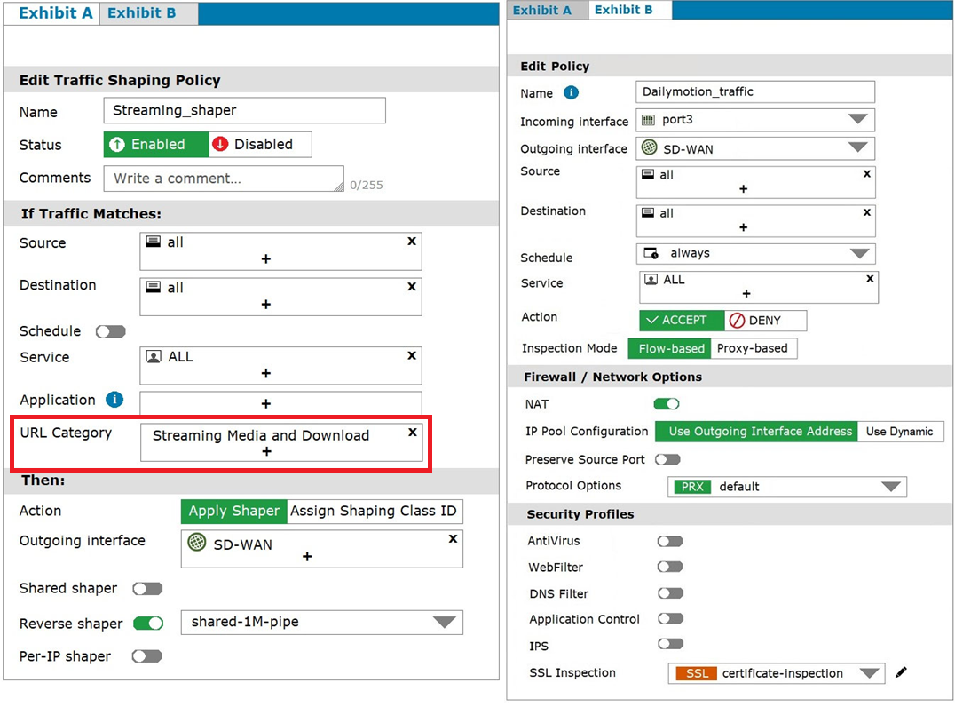 Exhibit A shows the traffic shaping policy and exhibit B shows the firewall policy.