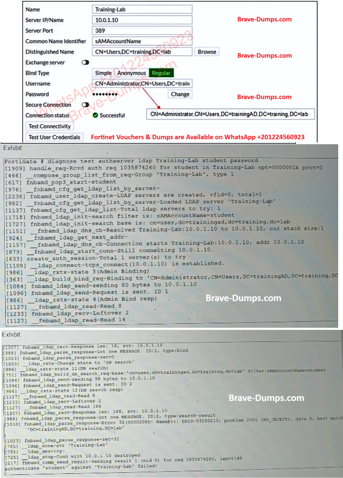 Examine the LDAP server configuration and output shown in the exhibits. Note that the Distinguished Name and Username settings on the LDAP server configuration have been expanded to display their full contents.