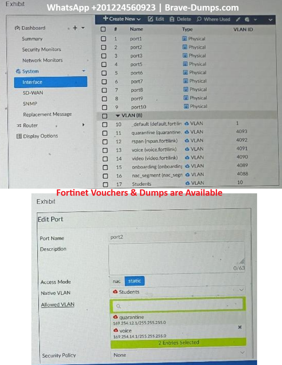 Examine the FortiSwitch port configuration and the FortiGate interface configuration shown in the exhibit.