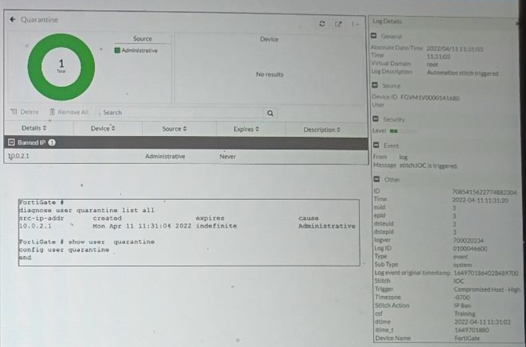 An administrator is testing the Security Fabric quarantine automation. The test device (10.0.2.1) is connected to a managed FortiSwitch device.