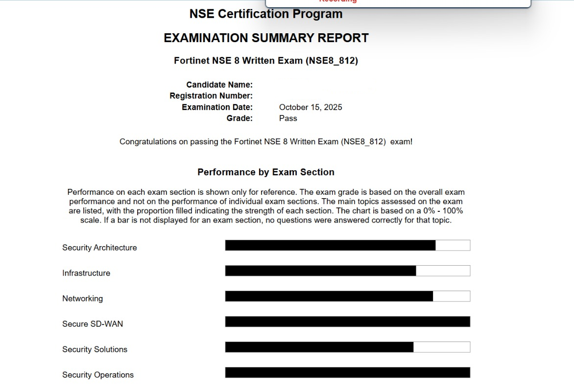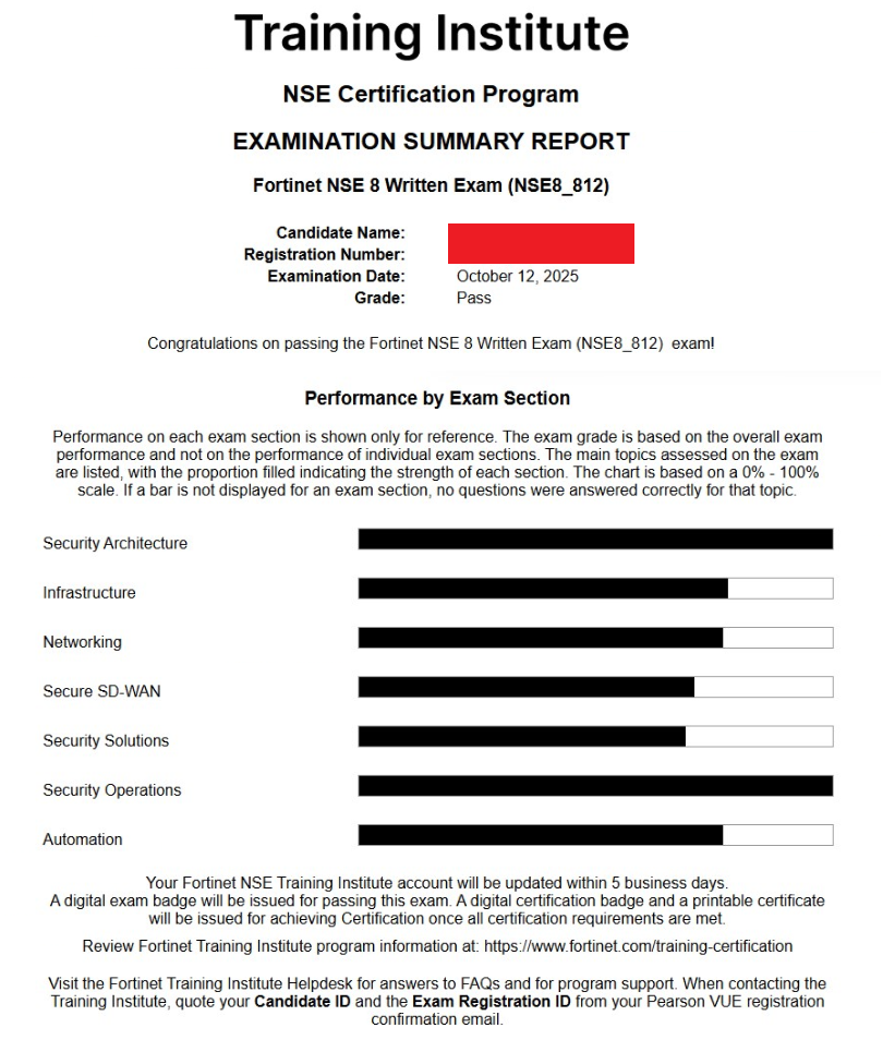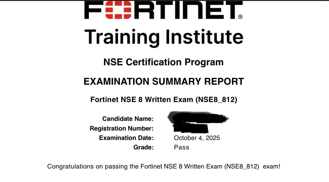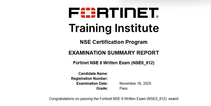 - 100% Score in the Real Fortinet NSE 8 - Writtent Exam (NSE8_812 Exam) at the Pearson VUE Testing Center