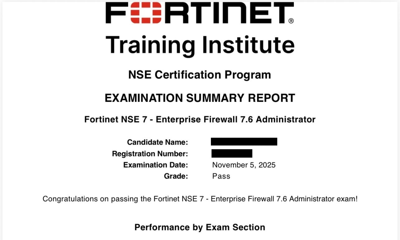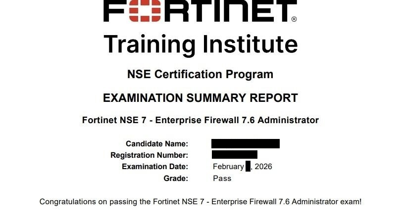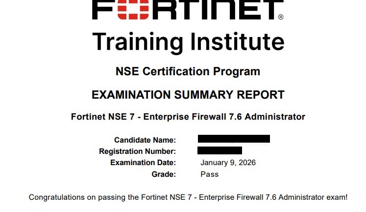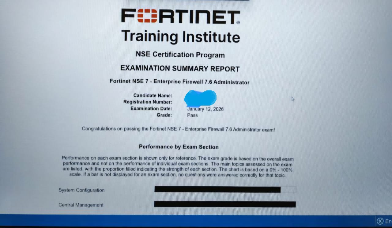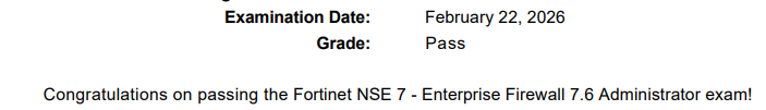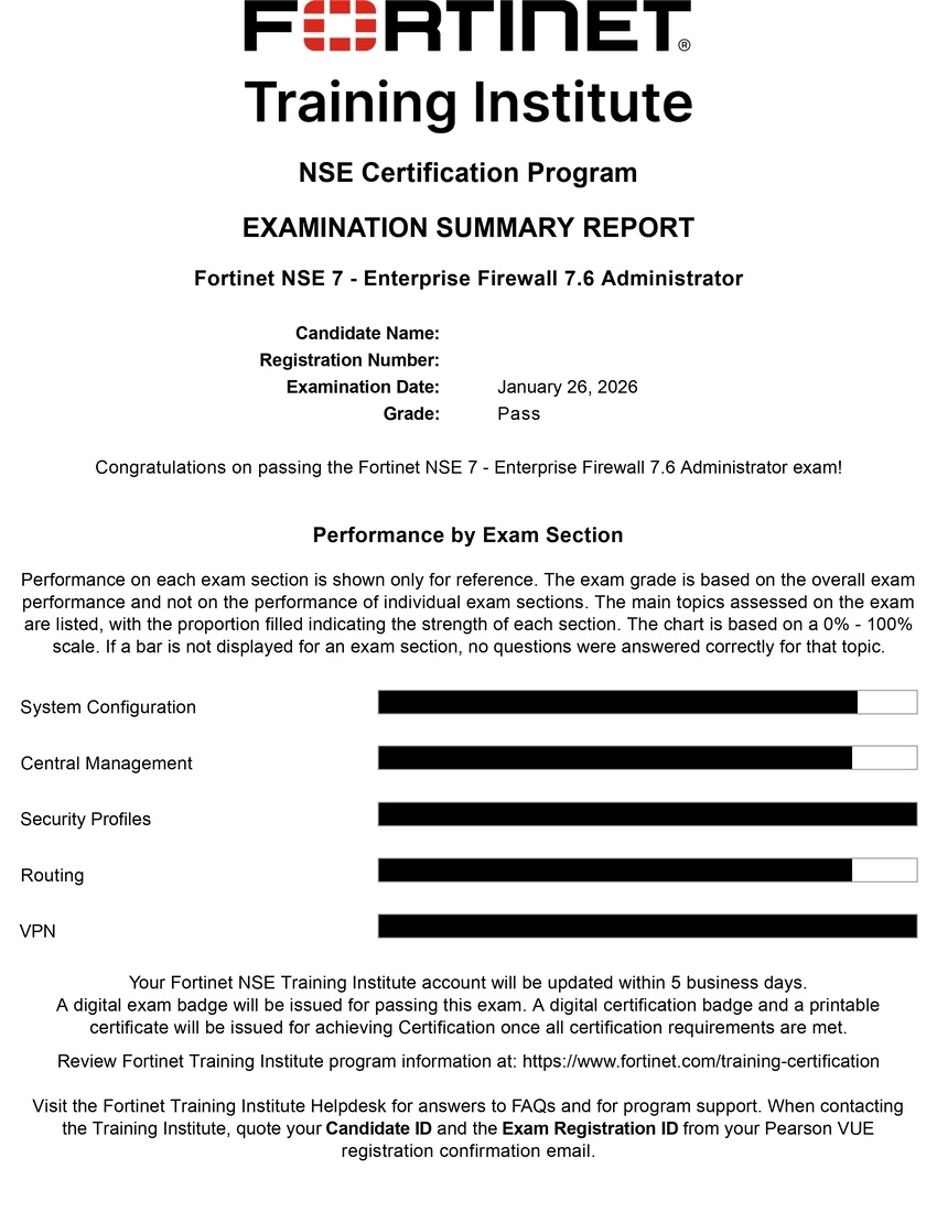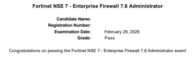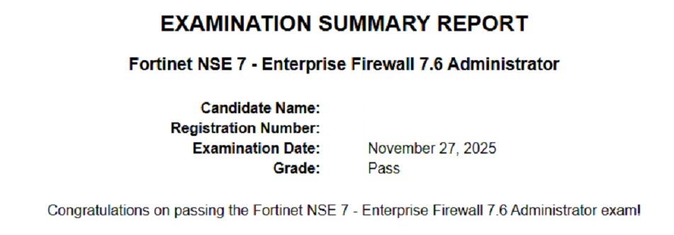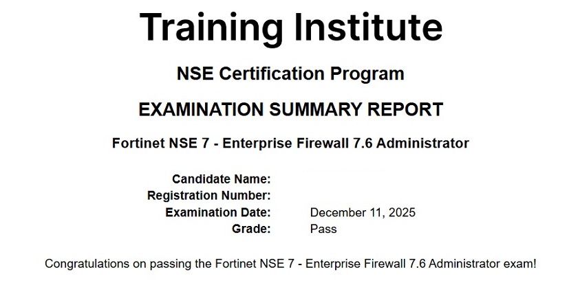● 100% score in the Real NSE 7 - Enterprise Firewall 7.6 Administrator Exam (EFW_AD-7.6) at the Pearson VUE Testing Center