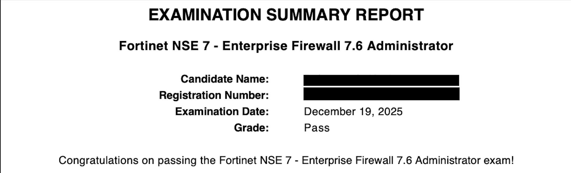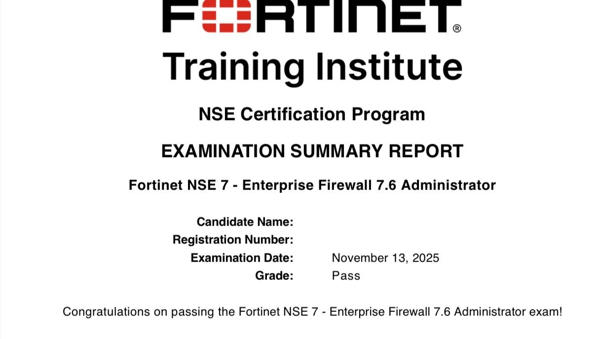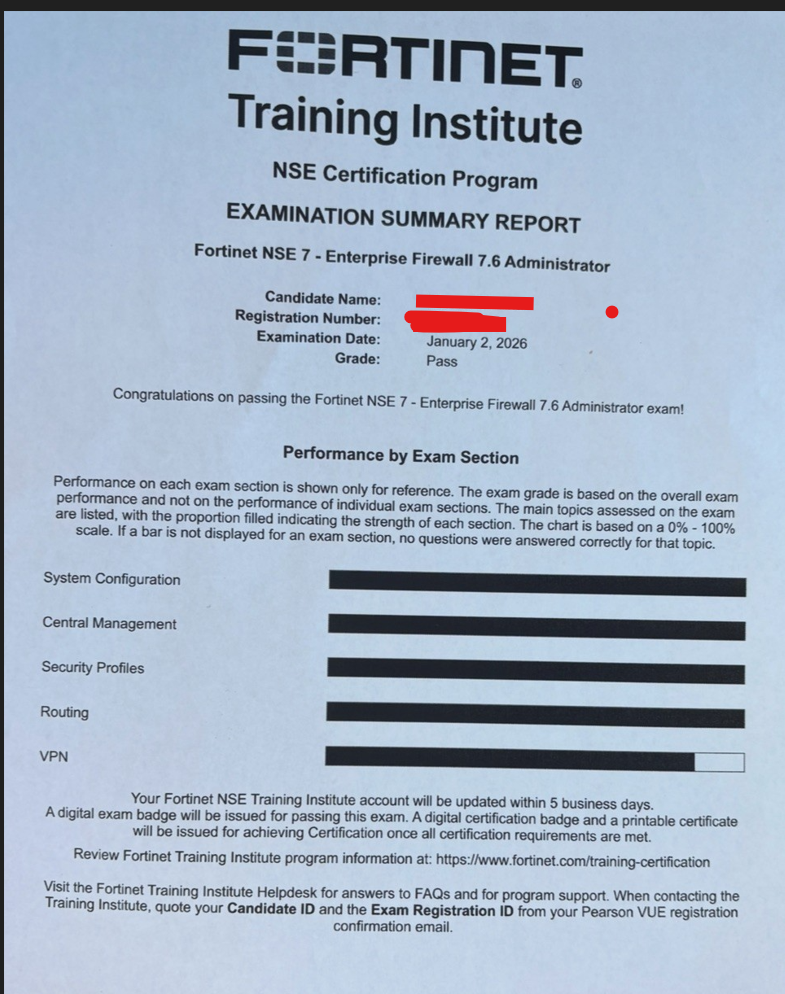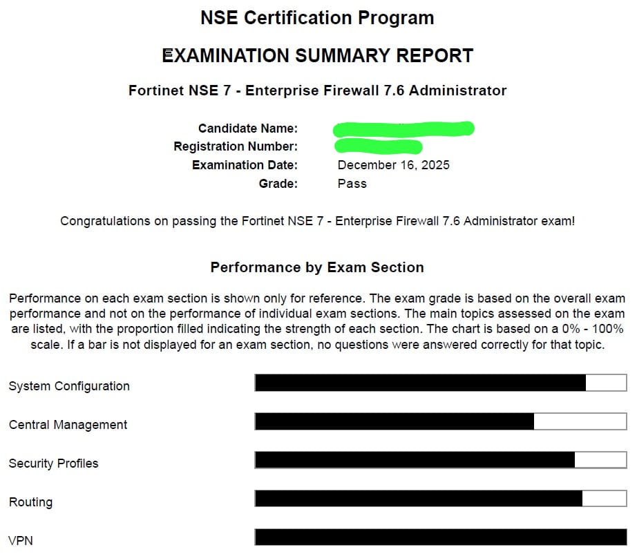 ● 100% score in the Real NSE 7 - Enterprise Firewall 7.6 Administrator Exam (EFW_AD-7.6) at the Pearson VUE Testing Center