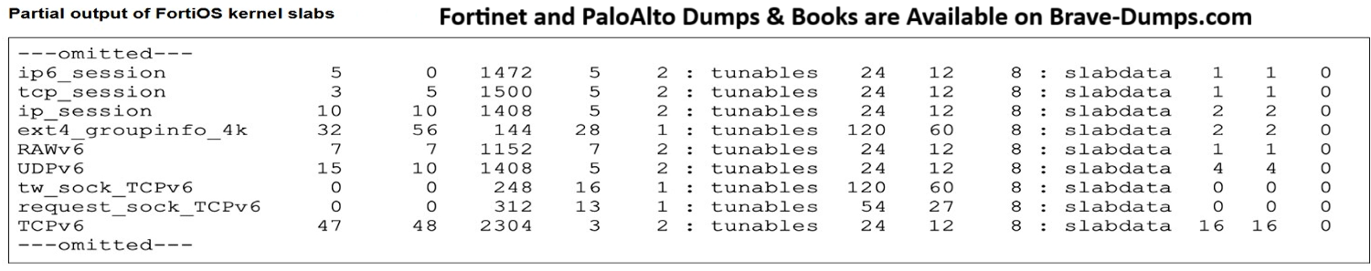 The partial output of FortiOS kernel slabs is shown.