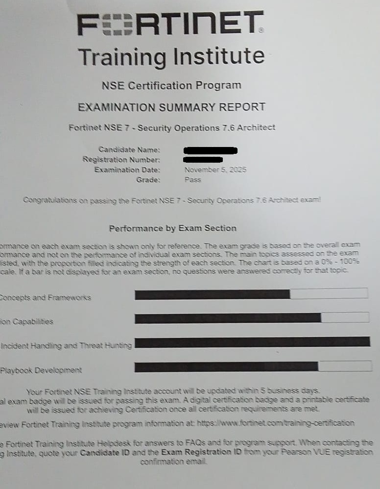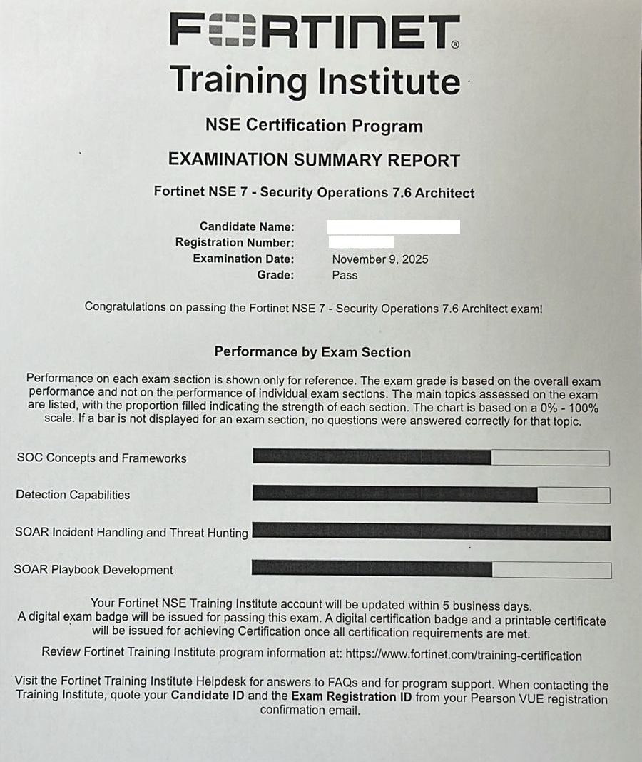 - 100% Score in the Real NSE 7 - Security Operations 7.6 Architect Exam (NSE7_SOC_AR-7.6 Exam) at the Pearson VUE Testing Center