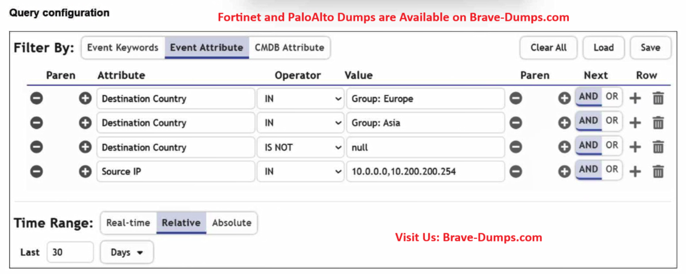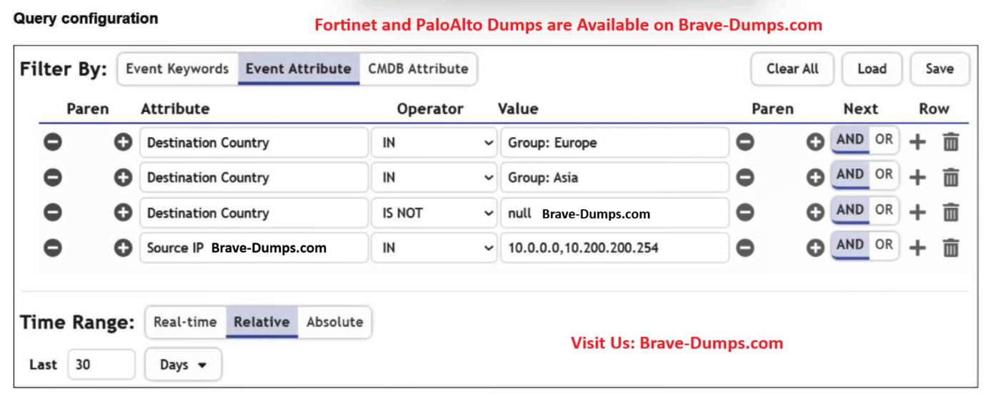 You are trying to find traffic flows to destinations that are in Europe or Asia, for hosts in the local LAN segment. However, the query returns no results. Assume these logs exist on FortiSIEM.