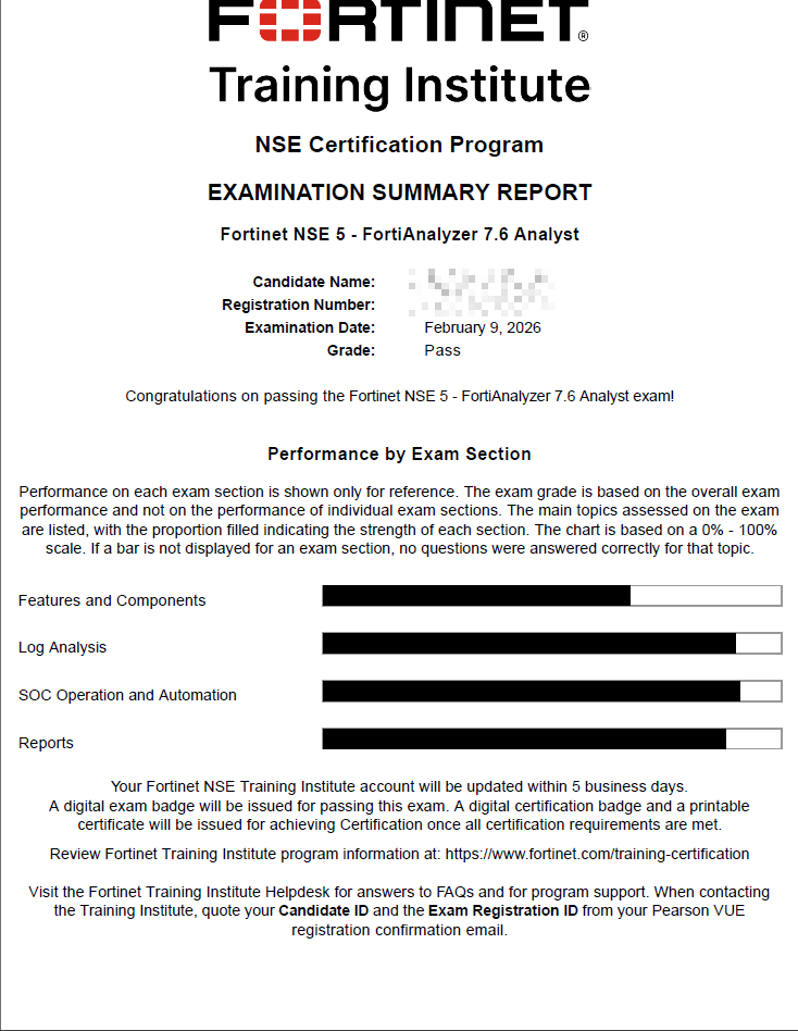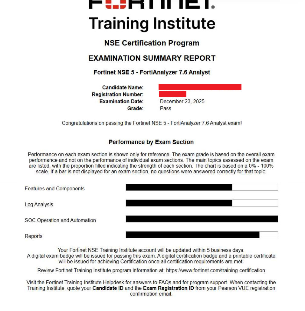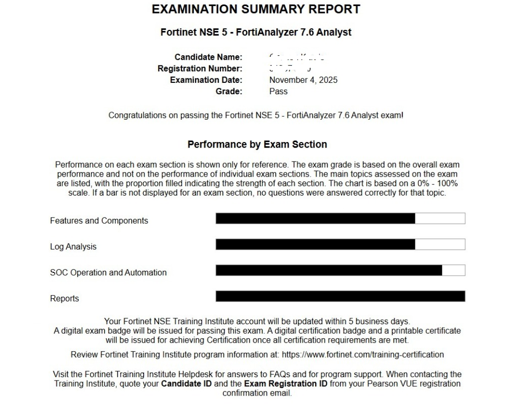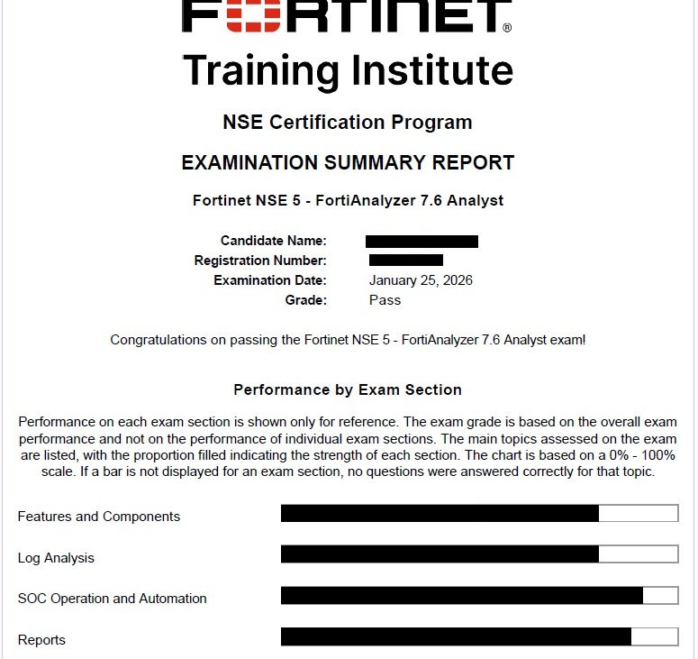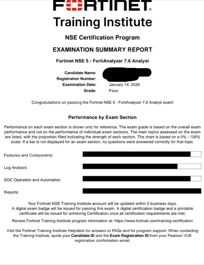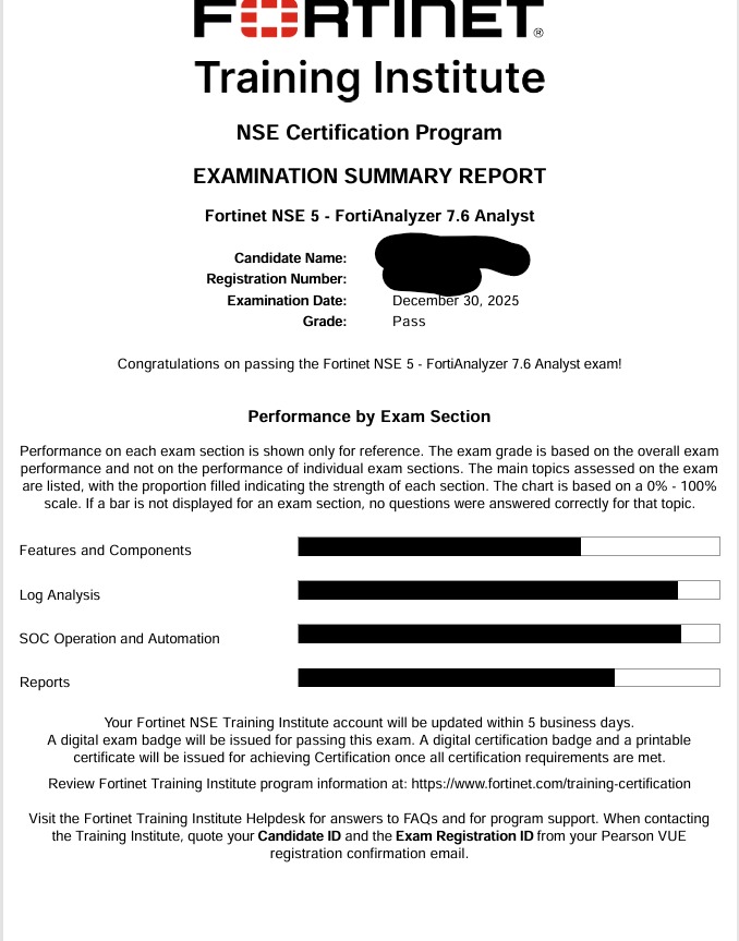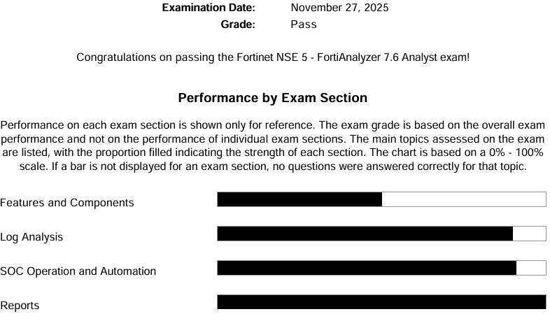 I passed my exam of FortiAnalyzer 7.6 on 30th Dec 2025. Below is the scorecard.