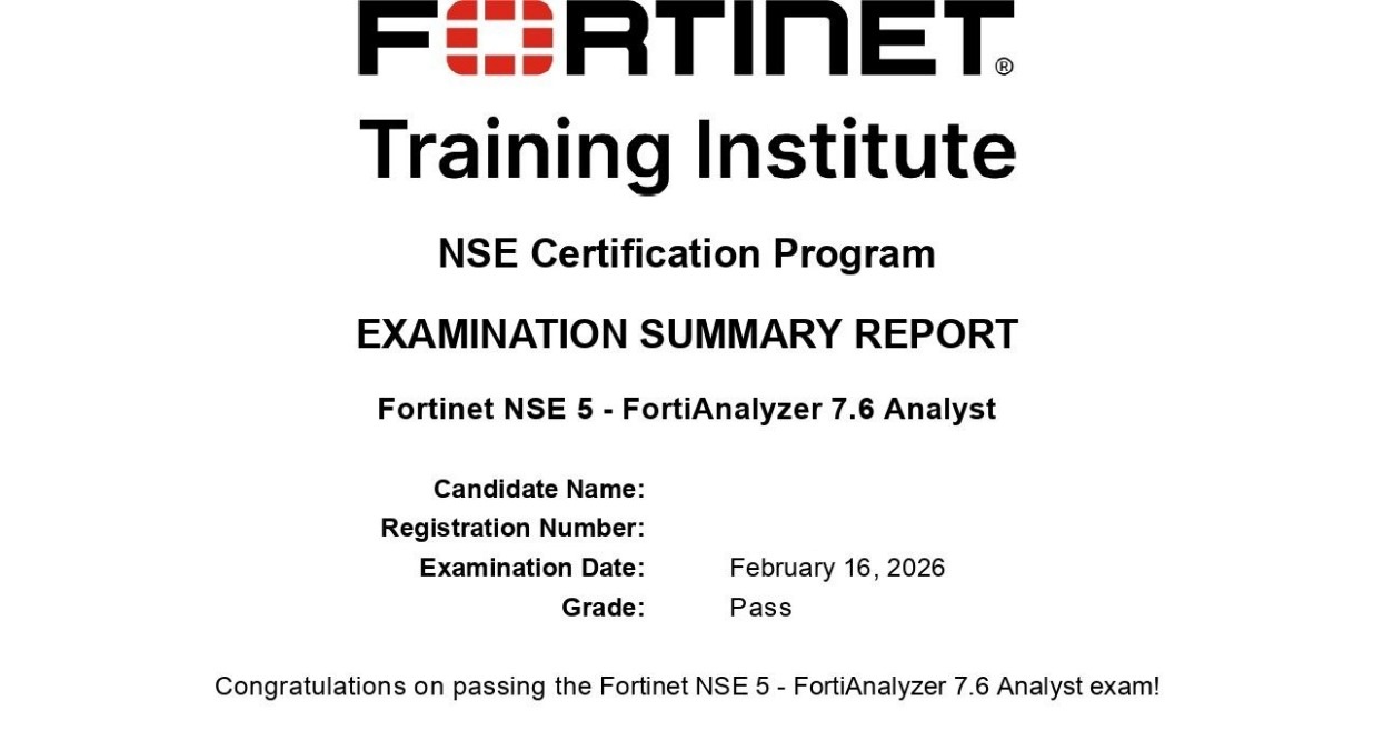 Excited to share that I’ve passed the Fortinet 𝐍𝐒𝐄 5 - 𝐅𝐨𝐫𝐭𝐢𝐀𝐧𝐚𝐥𝐲𝐳𝐞𝐫 7.6 𝐀𝐧𝐚𝐥𝐲𝐬𝐭 𝐞𝐱𝐚𝐦!