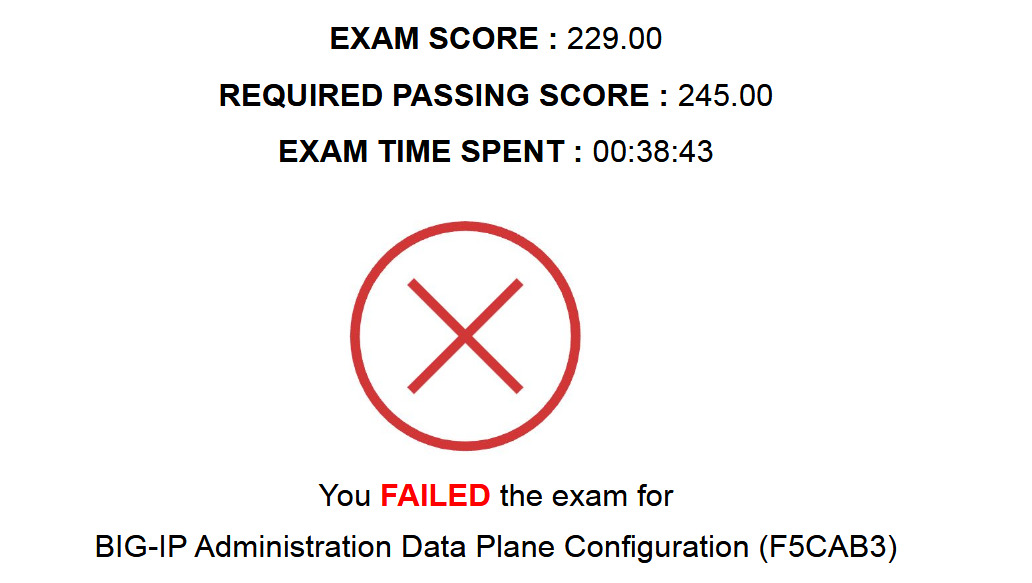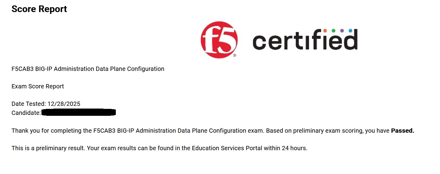 ● 100% Score in the Real BIG-IP Administration Data Plane Configuration Exam (F5CAB3 Exam) at the Testing Center