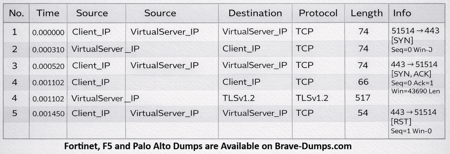 An LTM Specialist is troubleshooting a secure website that is inaccessible when using the Virtual Server on the LTM device. A tcpdump performed on the LTM device on the same VLAN where the Virtual Server exists is shown.