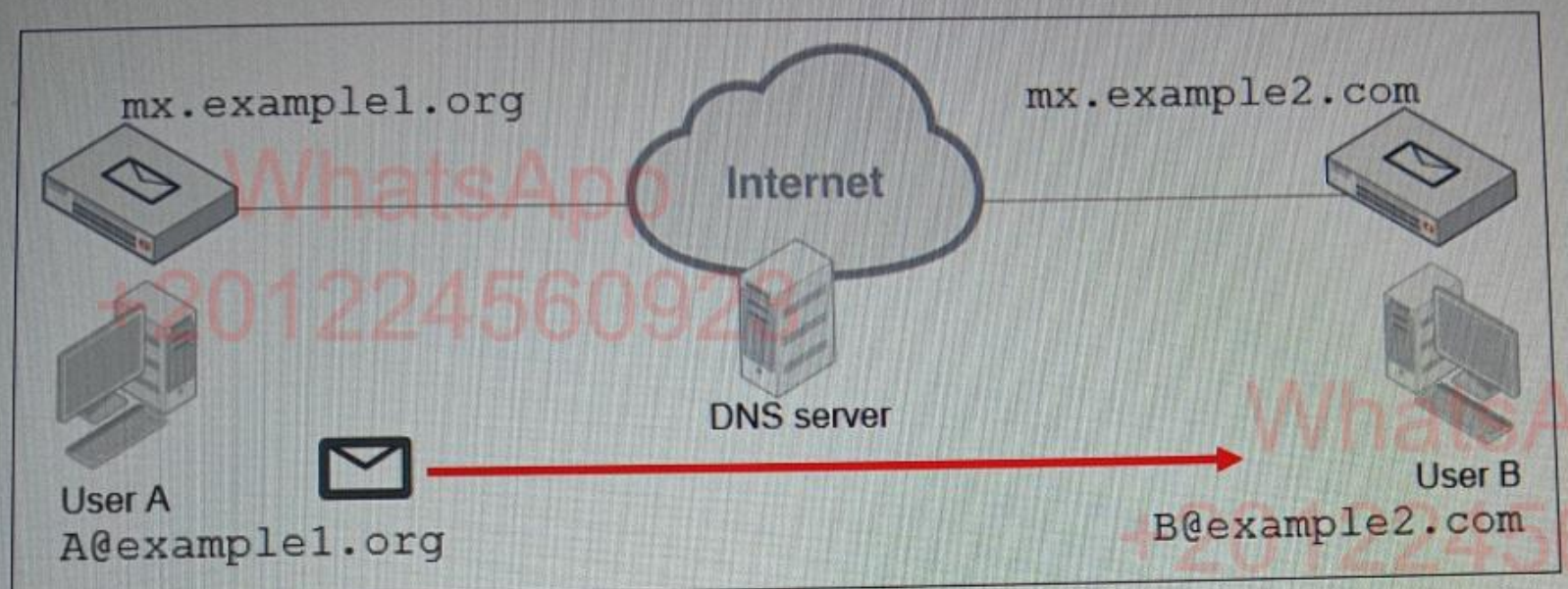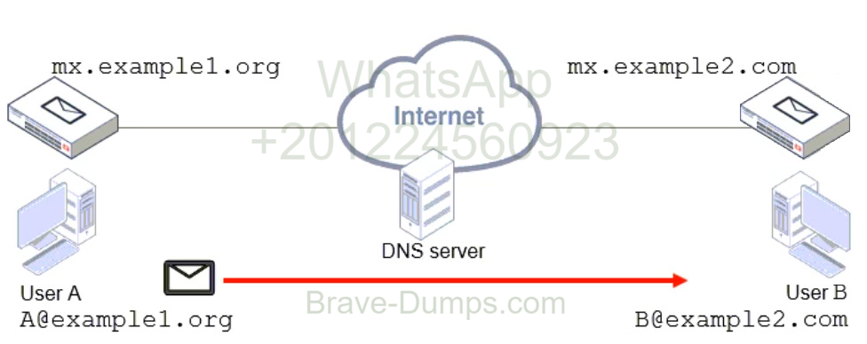 - C. User A’s MUA will perform a DNS MX record lookup to send the email message.