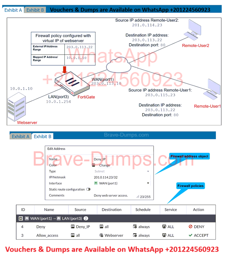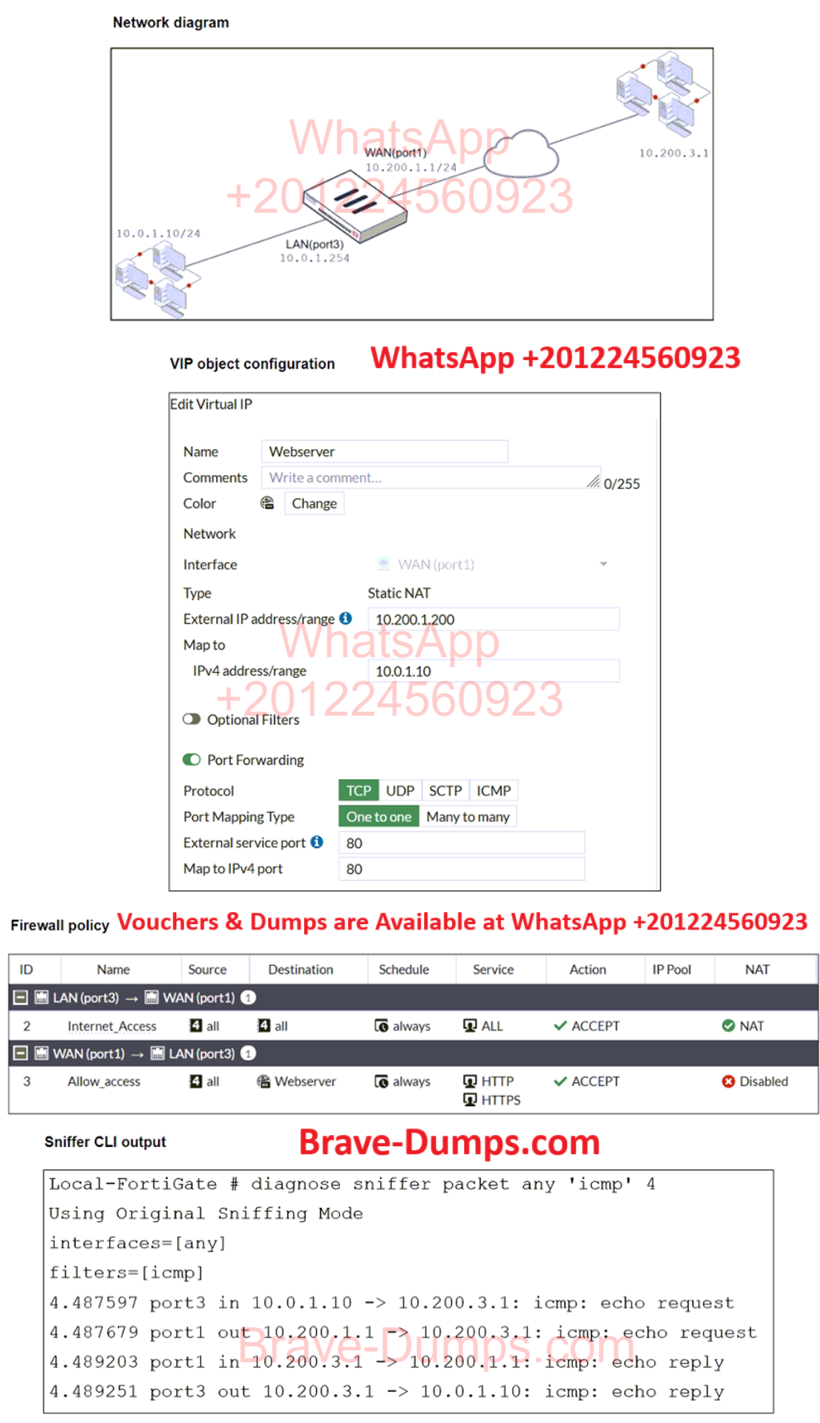 The exhibits show a diagram of a FortiGate device connected to the network, and the firewall configuration.