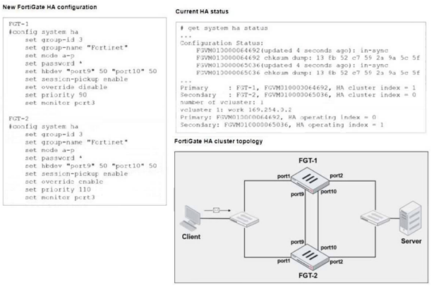 FGT1 and FGT2 are updated with HA configuration commands shown in the exhibit.