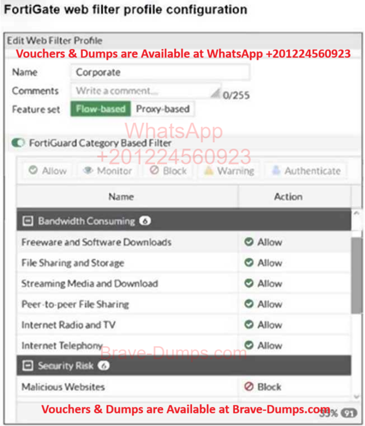 The exhibit shows the FortiGuard Category Based Filter section of a corporate web filter profile.