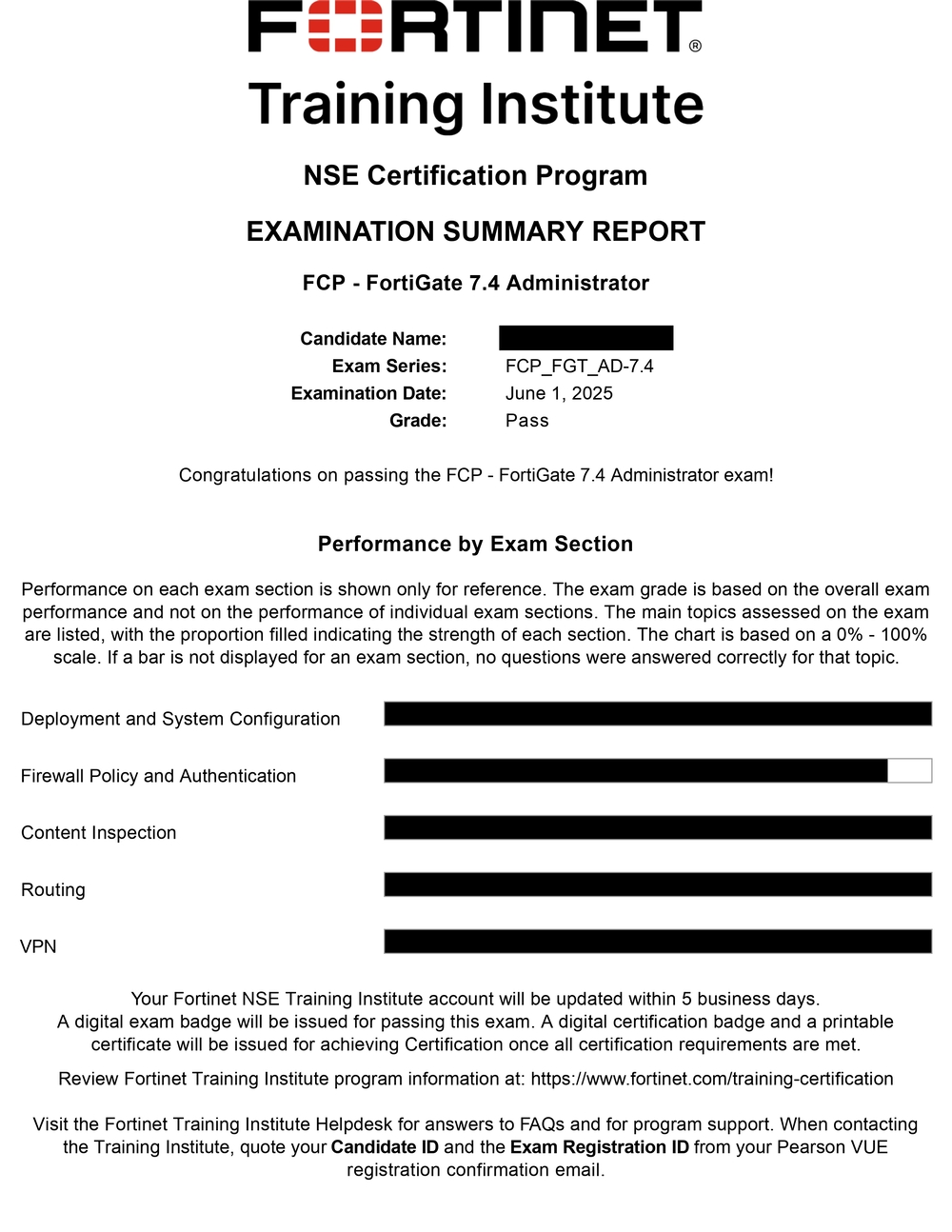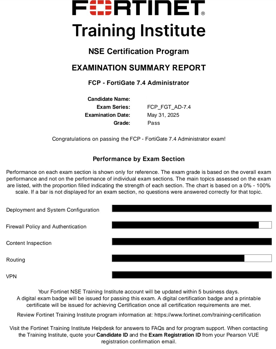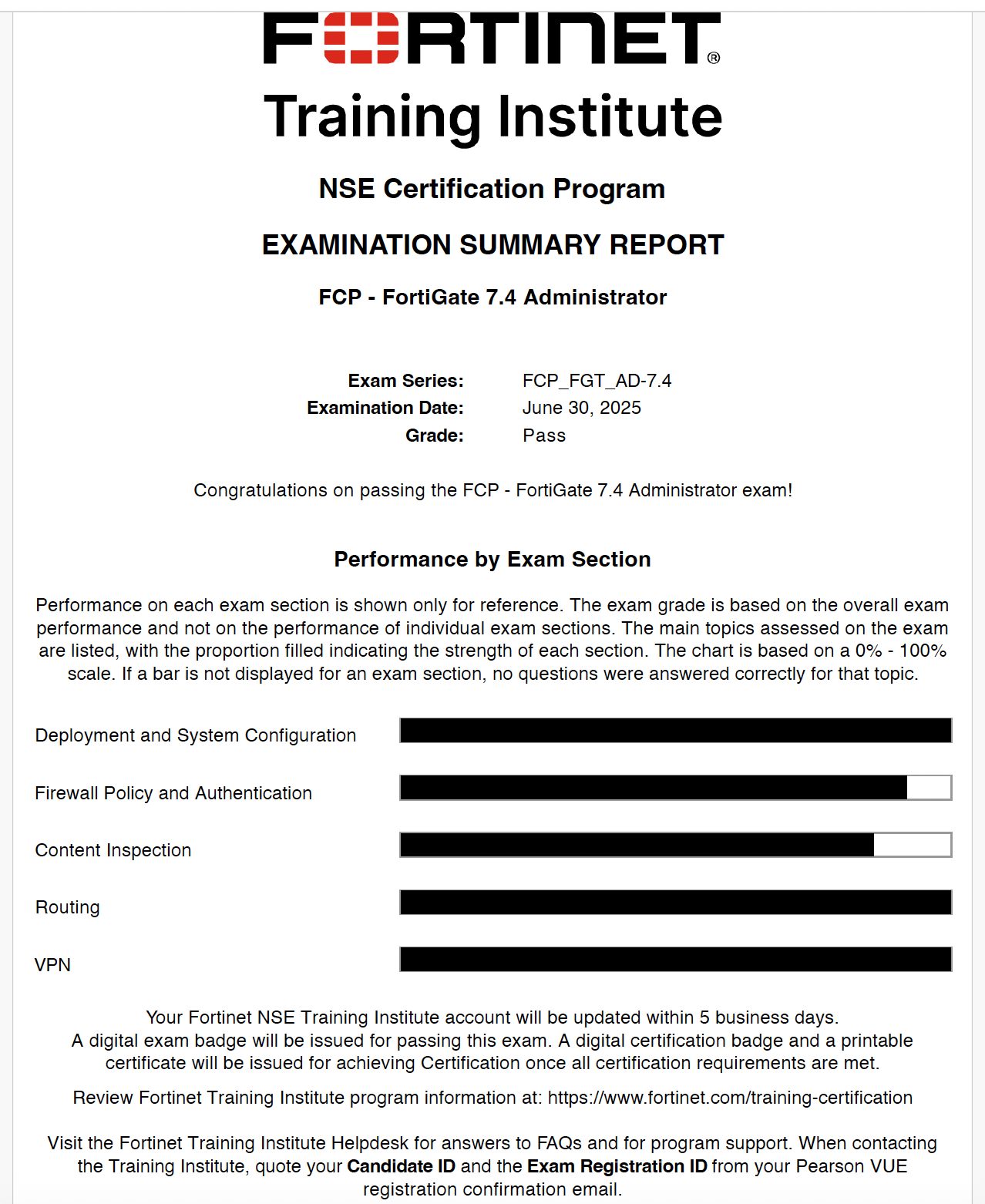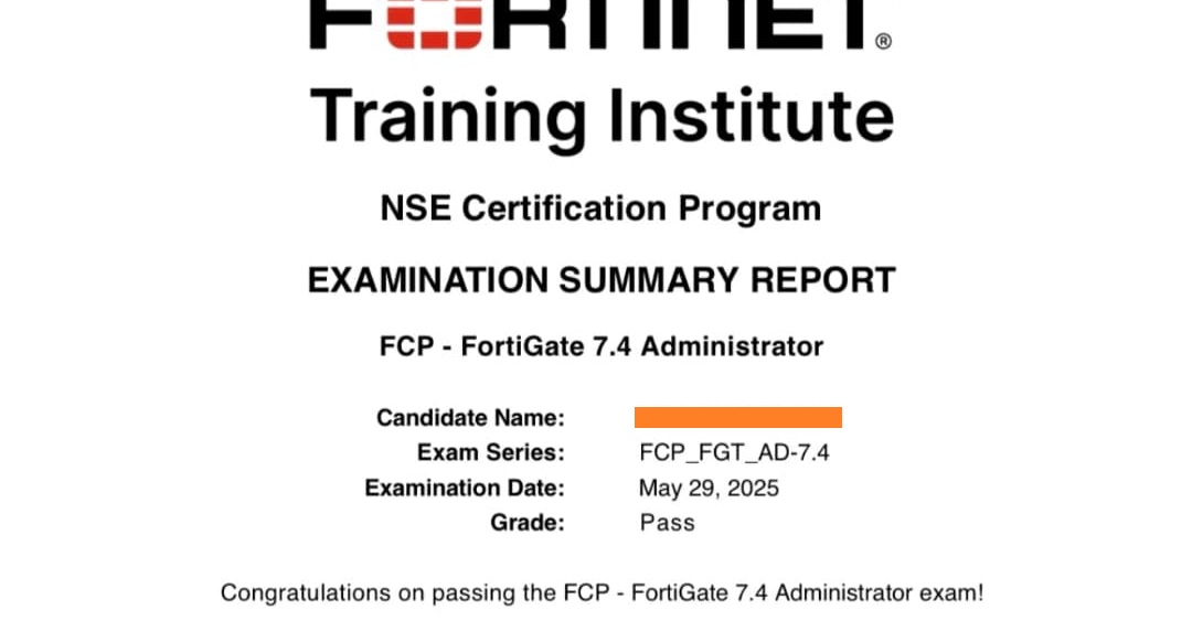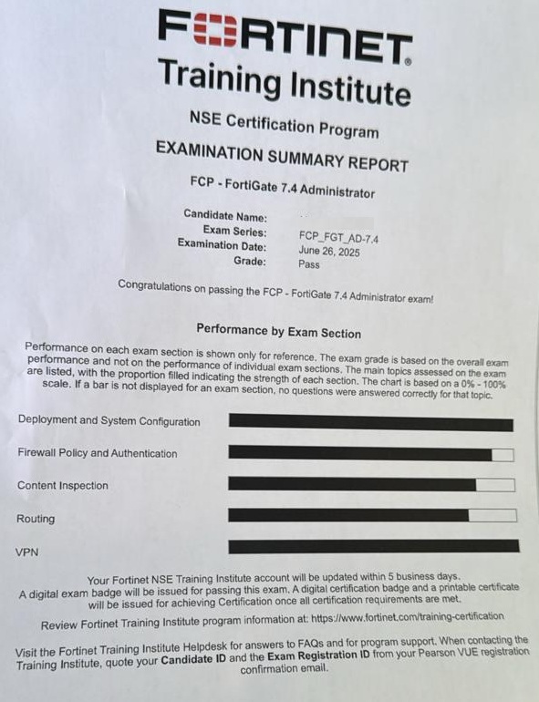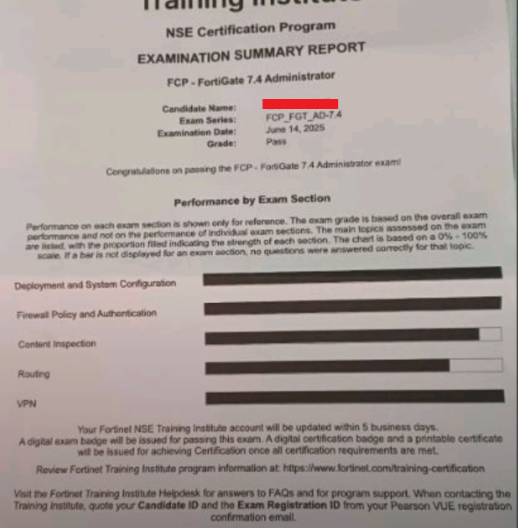 100% Score in the Real FortiGate 7.4 Exam (FGT_AD-7.4) at the Pearson VUE Testing Center